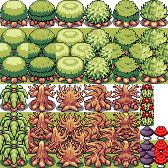I'm making a Zelda-like with a different scale from the Game Boy games, but struggled to find alternatives to Minish Cap or Link to the Past size trees. Here are 11 upscaled trees for a top-down game that are 64x64 (including tiling), plus some extras.